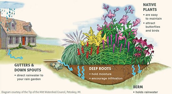 Rain gardens are shallow depressions in the ground planted with deep-rooted native plants designed to absorb rainwater. Water runoff is captured, filtered of its pollutants and infiltrated into the ground instead of running off, flooding out the yard and downstream neighbors, and entering directly into our waterways. Properly designed, rain gardens are practical, beautiful and functional. They also provide habitat for songbirds, butterflies and other beneficial wildlife.